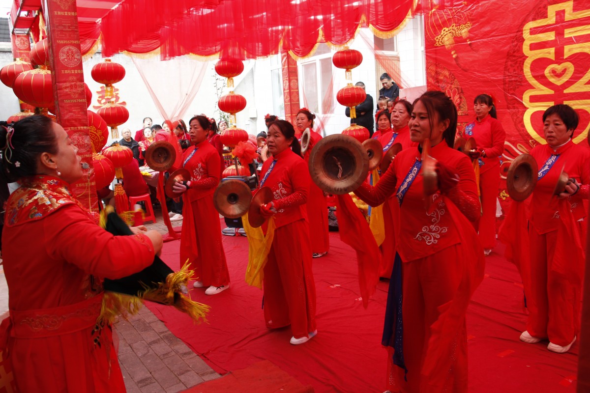 “接到主家的邀请后,我们就精心排练了锣鼓表演、舞蹈表演,今天在这里为两位新人添祝福,希望他们早生贵子,白头到老!”“木兰花”鼓乐志愿服务队队长、东郭村妇女主任任先枝说。
