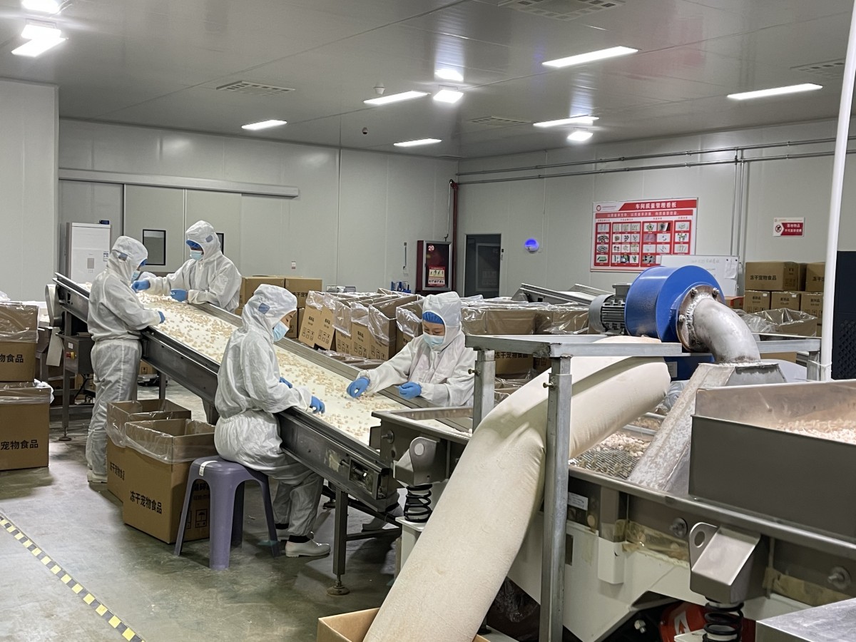 冻干食品采用真空冷冻干燥技术,能将新鲜蔬菜、肉类等食材中的水分直接去除,保持食材的色泽、风味、外观性状基本不变,最大程度保留食材中的维生素、矿物质、蛋白质等营养成分,可在常温下长期贮存、运输。这种技术在方便速食、宠物食品中广泛应用。基于冻干食品产业广阔的市场前景,2021年长子县在经济技术开发区筹建冻干食品产业园,2022年引进山西星萌科技有限公司,启动冻干宠物食品加工项目。