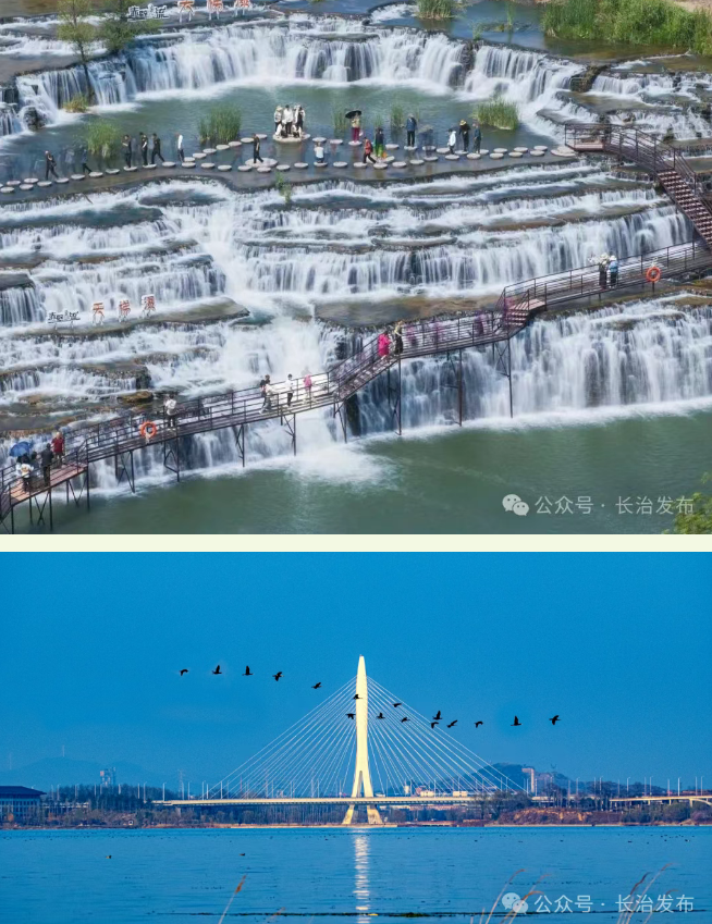 漳泽湖国家城市湿地公园:湿地公园面积58.72平方公里,负氧离子含量是市区的20倍,是三晋大地独一无二的城市湿地,也是山西省乃至华北地区湖泊、河流湿地的典型代表,属全国保护最完好的原生态、天然沼泽湿地之一,被誉为长治城市“会客厅”。不远处的多功能城市阳台、气势宏伟的神农湖大桥集演绎、观光于一体,一旁的江南园林风格韵味的滨湖国际大酒店更是成为八方游客“温暖的家”。