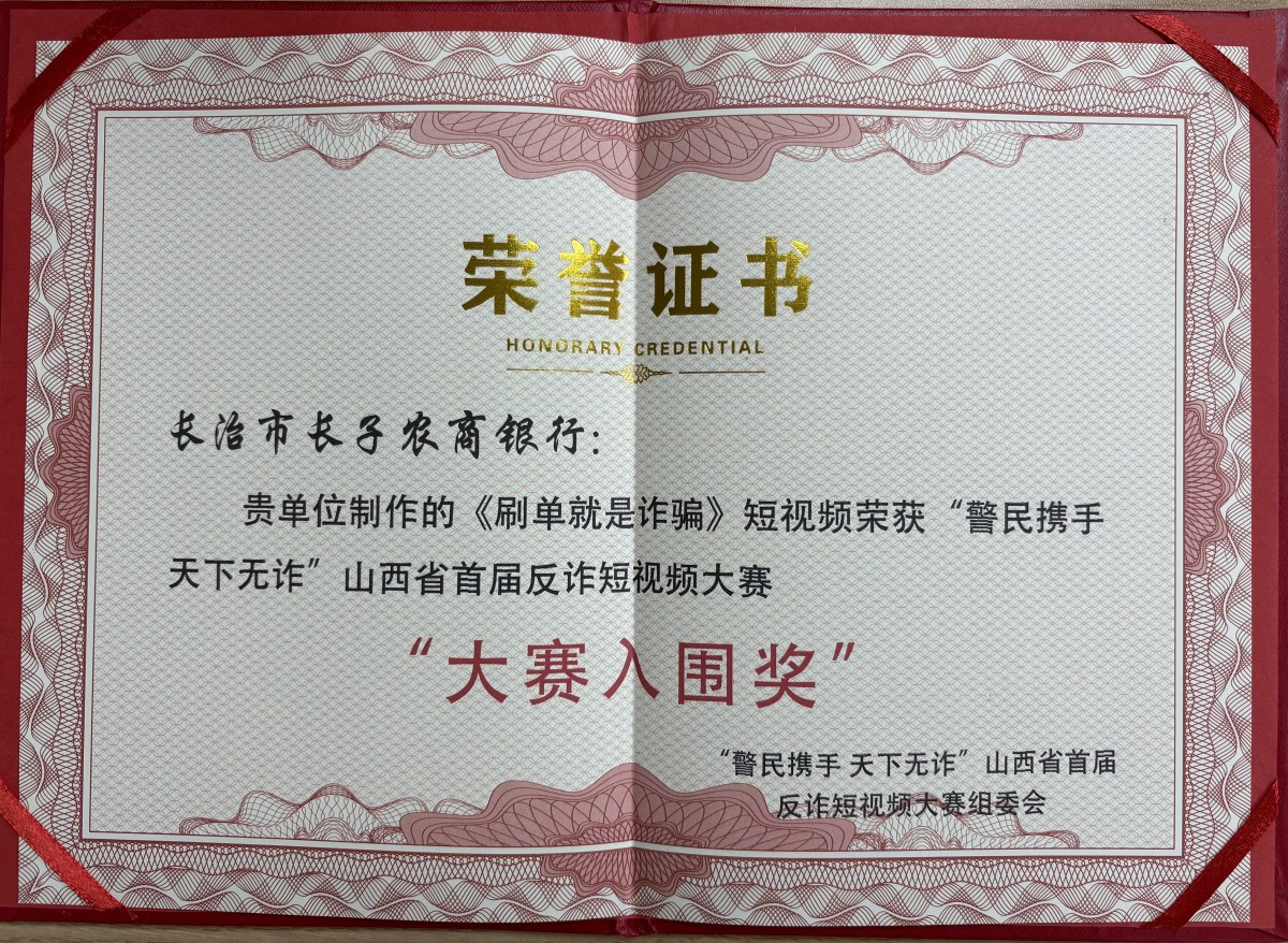 山西科技新闻网讯:(通讯员 王珊)近日由山西省公安厅主办,以“警民携手 天下无诈”为主题的山西省首届反诈短视频大赛颁奖典礼上,评选结果正式揭晓。长子农商银行精心创作并选送的反诈题材短视频作品《刷单就是诈骗》在众多参赛作品中脱颖而出,荣获大赛入围奖。