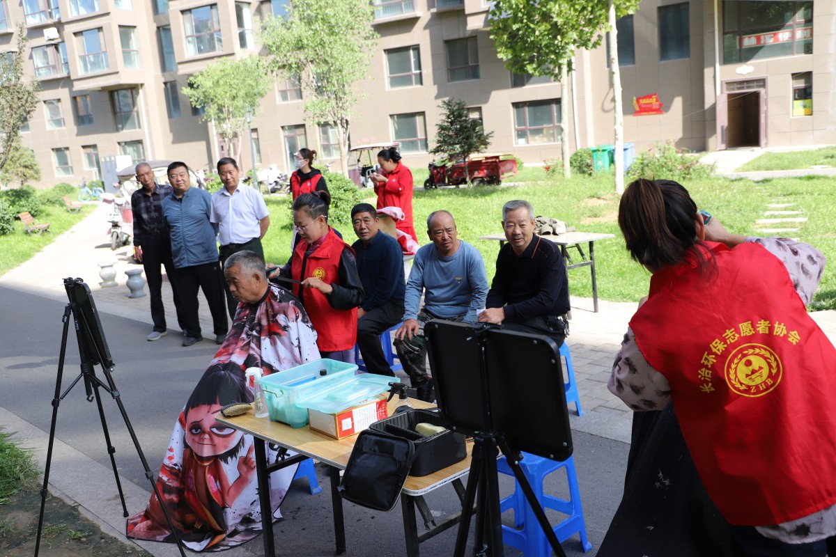 活动现场由小区物业精心布置,几张椅子、几套理发工具搭建起简易 “临时发廊”。长治环保志愿者协会的专业理发师志愿者提前到场准备,耐心接待闻讯而来的居民,其中以银发长者居多。志愿者们理发动作娴熟,同时与居民亲切交流,现场气氛融洽。