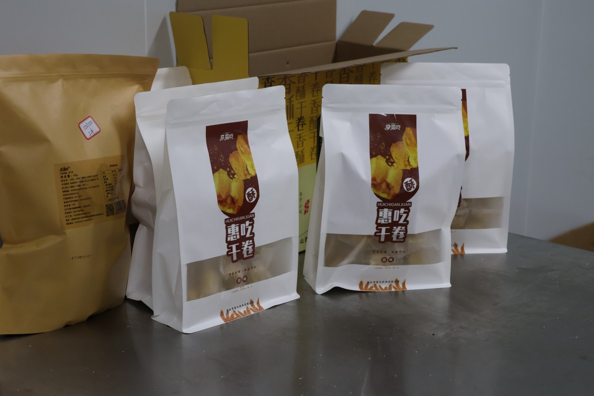 惠吃食品公司以小麦粉、玉米粉、食用盐等为基础原料,经过发酵、和面、分块、蒸、烤等多道标准化工序,创新推出香葱味、坚果味、红糖味及经典原味4款特色干卷,日产干卷1000余袋,预计年销售额300余万元。同时解决9人就业问题,人均月工资3000多元。