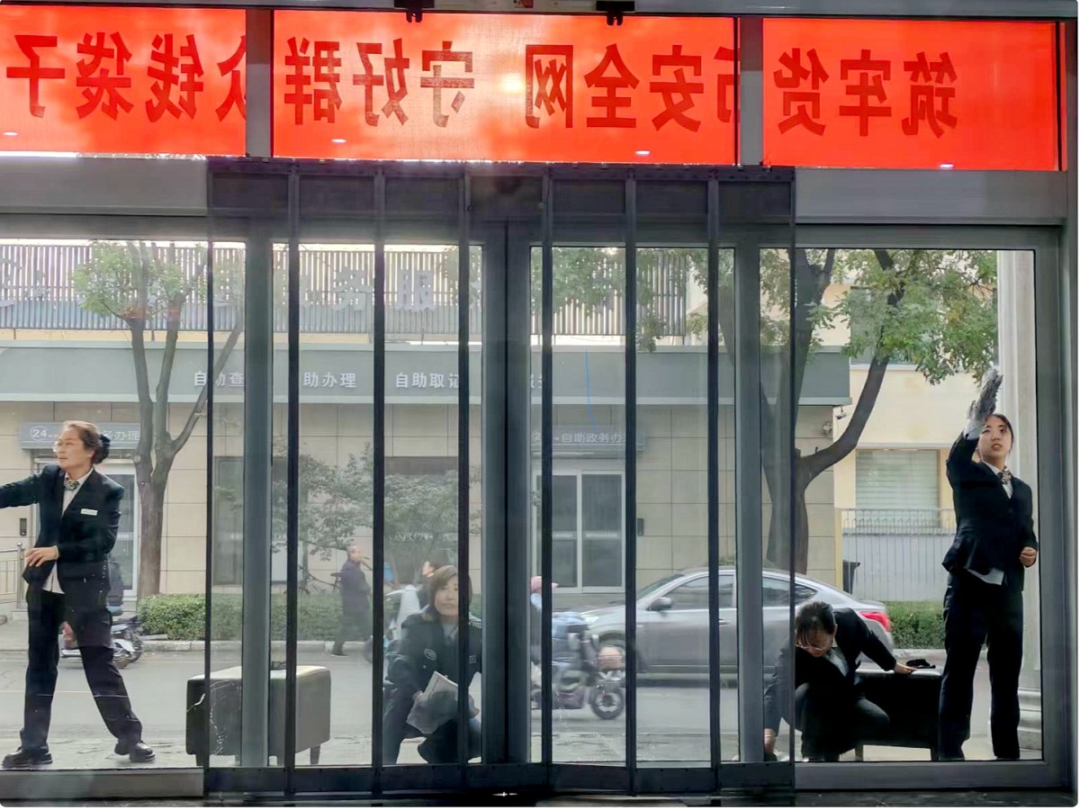 纷纷拿起工具,耐心细致地整理厅堂内外环境,不放过任何角落。智慧柜员机、填单台、宣传架被擦拭得光亮如新,键盘、密码器、点钞机等设备被小心擦拭消毒;后勤区域茶水间更是进行了深度保洁与消毒,门口的台阶、外部停车区域的落叶被一扫而空。便民服务区内,工作人员仔细核对,供来行客户使用的点验钞机、饮水机、轮椅、医药箱、雨伞等便民设施是否配齐,多媒体大屏上“劳工驿站”的招聘信息是否更新,咨询台上,产品手册、反诈手册、金融政策宣传资料被重新归整,客户办理业务动线被重新科学规划,历经一个多小时的布置,一个员工舒心、客户暖心的厅堂环境焕然一新。