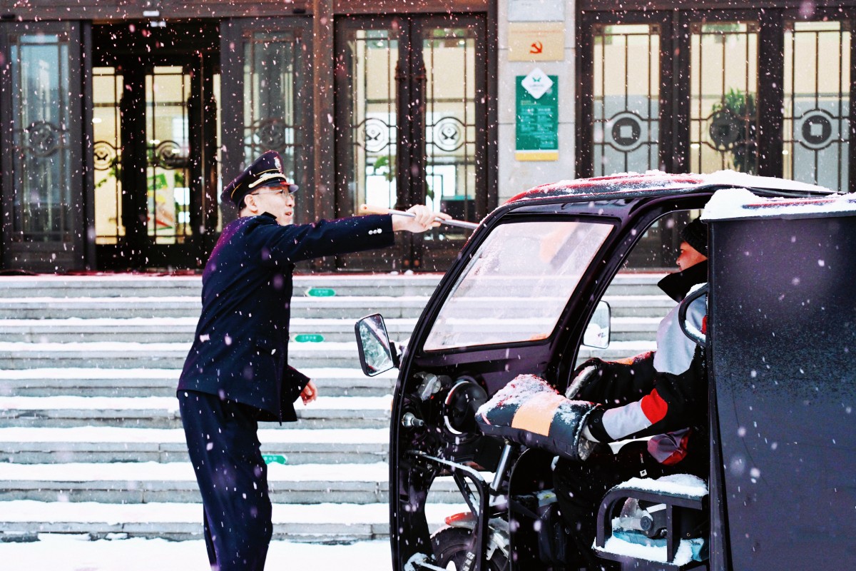 “雪天路滑,你们还专门帮我们扫雪,太贴心了!”一位前来办理业务的客户看着清理干净的停车区域,由衷地向保安同志竖起了大拇指,一句简单的夸赞,让寒风中的他们露出了朴实的笑容。