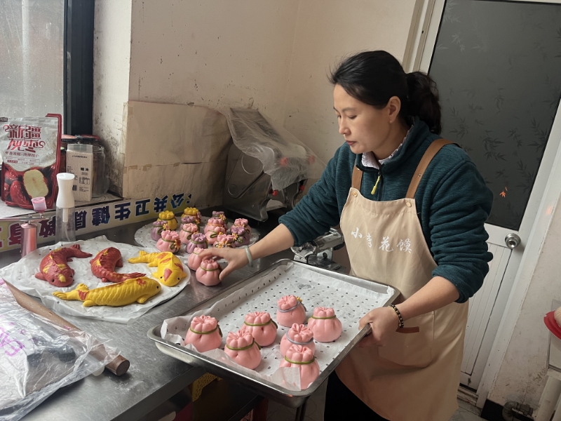 线上发力让这份传统年味打破地域限制,走进了更多家庭。去年以来,李霞在抖音、微信视频号开设专属账号,用镜头记录花馍从和面、发酵到塑形、蒸制的全过程,朴实的手艺、地道的风味吸引了网友关注,订单源源不断。线下市场同样热度不减,不少周边群众驱车数十公里前来订制,将这份承载着年味与祝福的花馍,作为春节走亲访友的首选伴手礼。“每年都在这儿订花馍,用料实在、味道正宗,造型也好看,送人有面子,自己吃也舒心。”正取货的村民王女士笑着说道。为满足企业团购需求,工坊还专门推出定制服务,精准对接企业福利需求,进一步拓宽了销路,带动订单稳步增长。