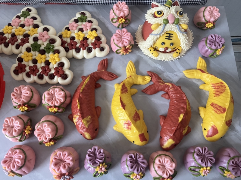 花馍的造型更是丰富多样、寓意深远,既有象征阖家团圆的圆形花糕、寄托长寿心愿的饱满寿桃,也有呼应马年新春、寓意招财纳福的精致福袋,每一款都栩栩如生、灵动可爱。“过年摆花馍、送花馍是咱这儿的老规矩,寓意日子红火、福气满满。”李霞手持剪刀,细细修剪着花馍的花瓣,动作娴熟而轻柔。她介绍,今年新增的“醒狮”主题款尤其受欢迎,订单占比已超过三成,成为马年新春的“爆款”单品。