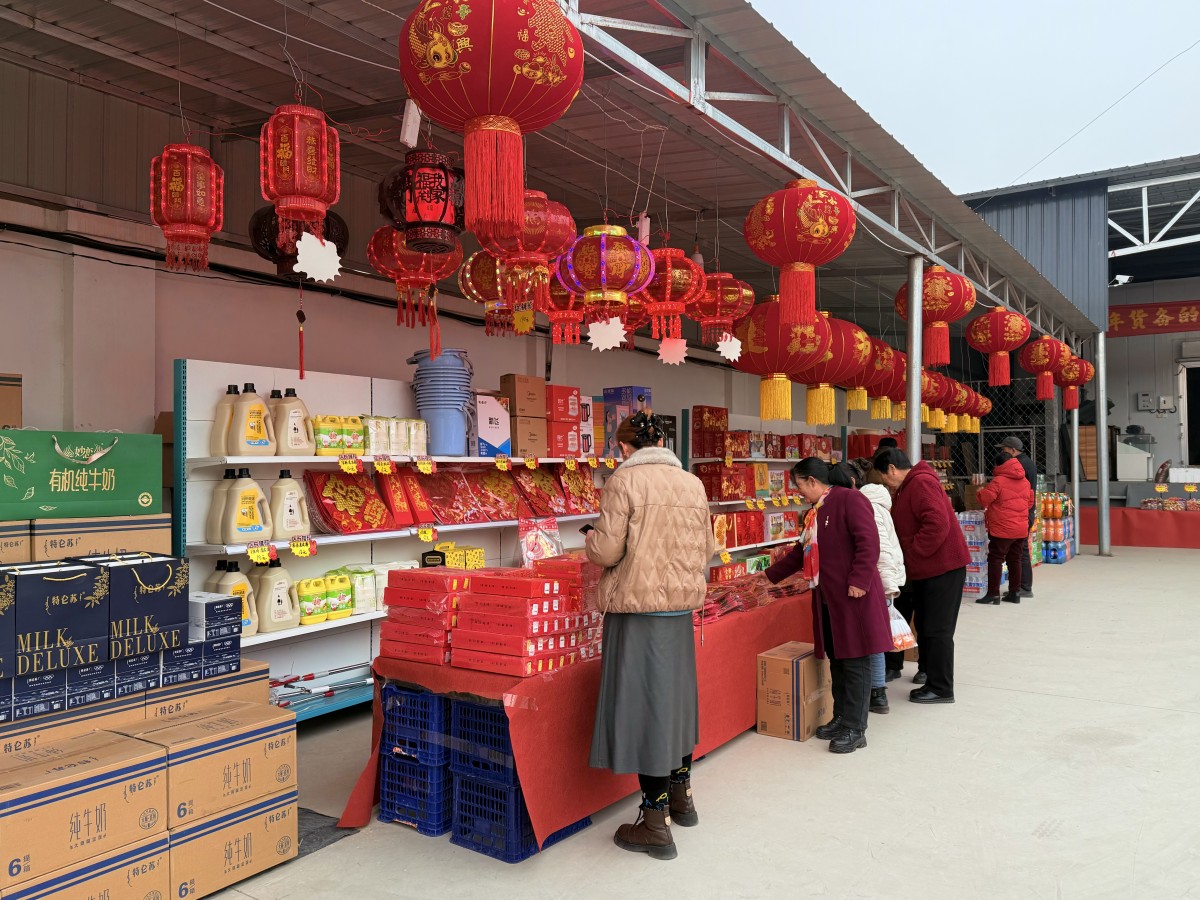 这座“变身”而来的年货集市,占地面积1000平方米,汇聚了食品、生鲜、日用、民俗等30余种品类、600余种商品,一站式满足村民办年货的各类需求。集市内,“购年货享优惠”“甄选八方好物 惠及全村乡亲”等红色横幅格外醒目,品牌粮油、特色礼盒、糖果副食、各类调味品整齐码放、琳琅满目,红彤彤的春联、寓意吉祥的灯笼点缀其间,与各类年货相映成趣,不仅丰富了商品种类,更烘托出浓厚的新春喜庆氛围。“真是太方便了!不用往县城跑,这里东西齐全、质量放心,价格还比外面实惠不少,这个集市办得太接地气、太实在了!”村民陈素兰提着刚选购的糖果和新鲜羊肉,脸上满是笑意,连连称赞。