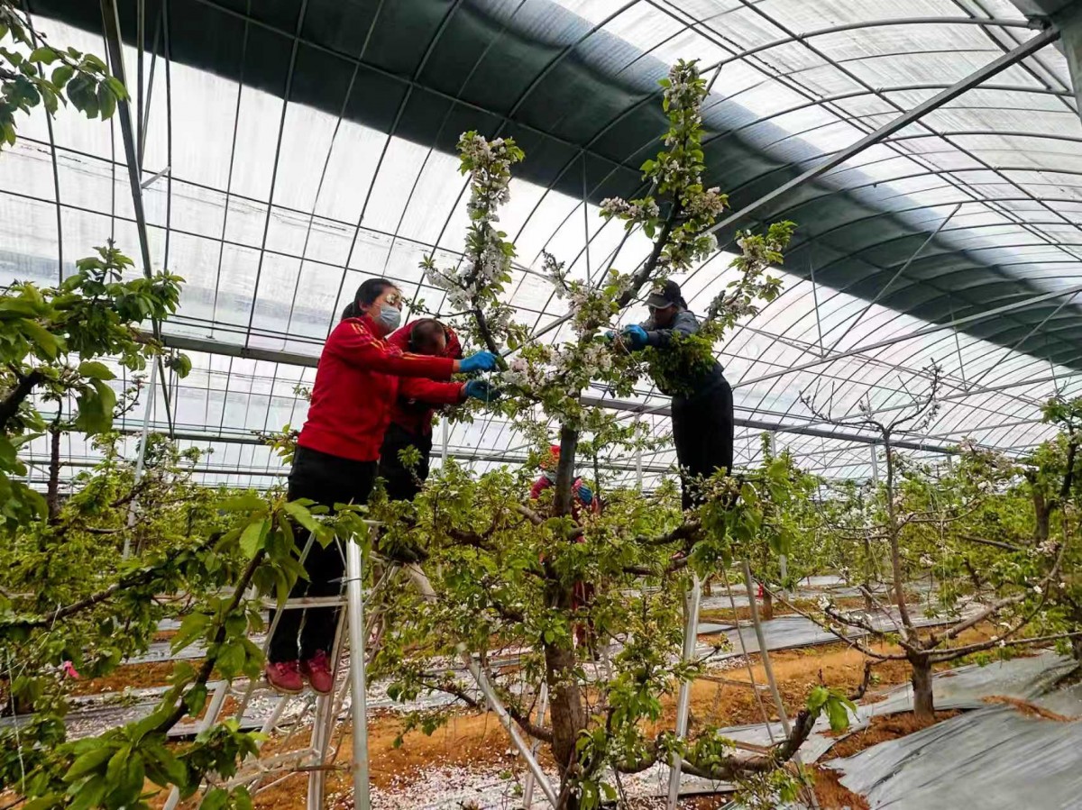 当前正值樱桃花盛放、田间管护的关键时期,园区工作人员抢抓农时,穿梭于花海之间,有条不紊地开展疏花、疏果、人工辅助授粉、温湿度精准调控等精细化田间管理作业,保障樱桃树茁壮成长,为后期果品提质增效、丰产丰收奠定坚实基础。
