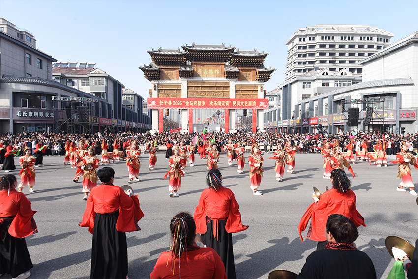 气势磅礴的威风锣鼓、腾跃翻飞的龙舞狮跃、灵动诙谐的旱船秧歌、精妙绝伦的非遗绝活轮番亮相。下午2时许,展演在碾张乡铿锵豪迈的《金马纳福锣鼓欢》威风锣鼓队表演中拉开序幕,随着鼓点变幻,齐如军阵,动如流霞,锣鼓喧天,瞬间点燃全场热情,奏响了新时代奋进最强音。慈林镇的《马踏春潮狮舞欢》,舞狮+扇舞+唢呐+非遗变脸绝活穿插上演,舞者扇舞流韵,脸谱瞬息万变,醒狮灵动威武,擂响乡村振兴、再创辉煌的坚定决心。大堡头镇的《尧乡新韵》,以灯笼引路、旱船开篇,汉服添韵、狮舞纳吉,龙跃呈祥、戏曲传承,串联起民俗之美、发展之果、奋进之志。宋村镇的《盛世扛桩·马跃新程》,青年手持花伞翩然起舞,儿童身骑小马笑靥如花,中年肩挑扁担演绎农耕文明,传递着全镇人民对全县父老乡亲的深情祝福。色头镇的《骐骥驰骋色头扬 文旅兴镇古韵长》,融合了扇舞、话剧、踩高跷等多种艺术形式,彩扇翻飞、舞步婀娜、高跷步伐稳健,尽显色头文旅强镇独特魅力。教育系统的《春风育桃李 骏马向未来》,师生们踏着喜庆热烈的舞步,孩子们身着特色国风服饰,用灵动舞姿传递新春欢腾,以昂扬姿态彰显奋进锋芒,充分展现了长子县教育事业发展的蓬勃生机。南漳镇的《锣鼓贺元宵 舞狮闹新春》,铿锵有力的鼓点节奏明快,震天锣鼓气势雄浑,金狮腾挪跳跃,时而威猛昂扬、时而憨态可掬,舞出了南漳人民奋发向上、开拓进取的精气神。鲍店镇的《骏马奔腾擂金鼓 意气风发展宏图》,威风锣鼓与鲍家拳同台绽放,威风锣鼓气势磅礴,鲍家拳刚柔相济,鼓乐齐鸣,拳法生风,彰显了鲍店人敢闯敢干、昂扬向上的精神风貌。丹朱镇的《精卫填海》,重现了精卫鸟衔木石、填沧海中华古老神话传说,故事情节跌宕起伏,人物刻画入木三分,诠释出了全镇上下一马当先、锲而不舍、攻坚克难、奋发图强的傲骨雄风。南陈镇的《马跃新程·鼓舞飞扬》,将长子威风锣鼓的雄浑、花伞秧歌的灵秀、本土民俗“二鬼打架”的奇趣与现代舞蹈的活力融于一炉,挥洒出一幅“金马启新岁”的鲜活画卷。石哲镇的《红红火火闹元宵》,彩绸舒展如流云奔涌,长扇开合似繁花绽放,红火的秧歌,欢腾的舞姿,激昂的旋律,奏响石哲镇乡村振兴的奋进乐章。常张乡的《祥龙献瑞·十二花神贺新春》,精心编制出一场花与龙的邂逅、古与今的对话,巨龙翻腾跳跃,鱼骨扇轻盈旋转,十二位花神身着锦绣华服、踏歌而来,寓意岁月圆满、家国昌盛。最后,由长子县体育中心带来的《全民健身闹元宵 策马扬鞭启新程》,将健身秧歌、武术等项目巧妙融合,在传递科学健康生活方式的同时,生动体现了长子人民昂扬奋进的时代风貌。